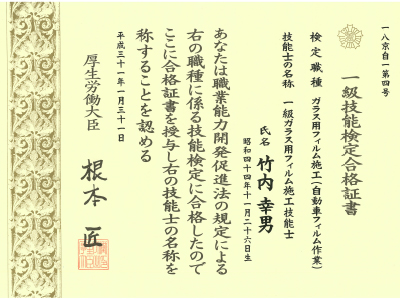 技術と知識の両方が必要となる自動車フィルム施工技能士。一般的になじみは薄いですが厚生労働大臣が指定する機関である日本ウィンドウ・フィルム工業会が認定する資格です。 技術と知識を兼ねそろえた施工技能士が丁寧な応対をいたしますので安心できます。